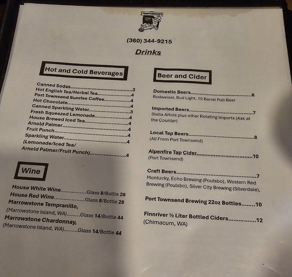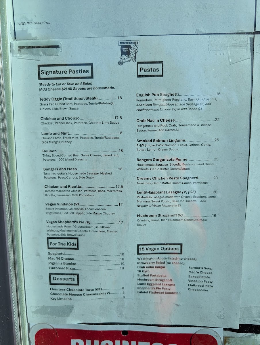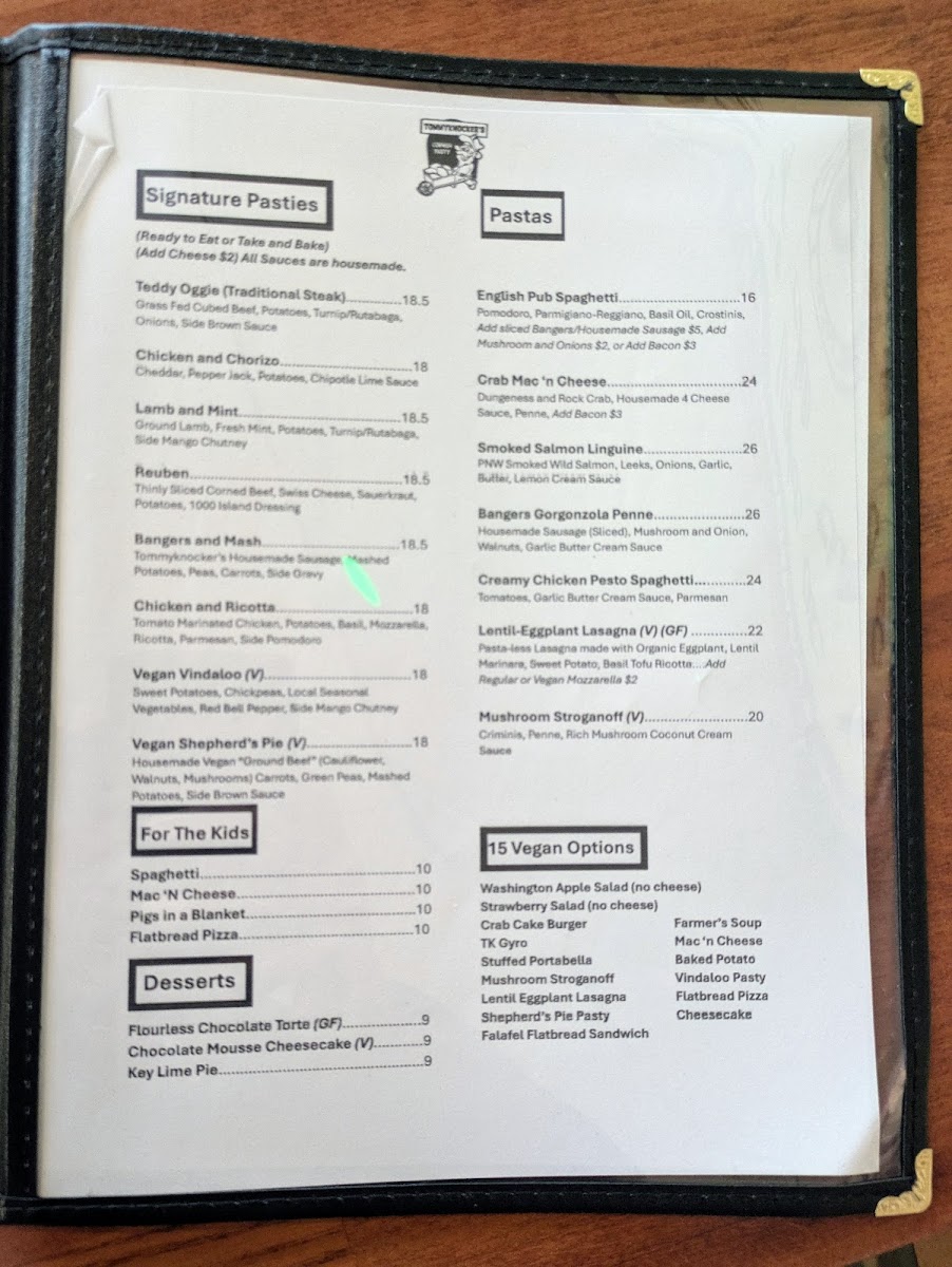 Guests often find themselves enjoying these dishes during lunch or dinner, where the generous portions and homestyle flavors encourage sharing and lingering over good conversation. Whether you're stopping in for a quick bite or settling down for a relaxed meal, the menu’s emphasis on rich, savory pasties like the Lamb & Mint or Vegan Shepherd’s Pie, alongside housemade sides and comforting pasta dishes, complements the warm and casual atmosphere of this Port Townsend spot.