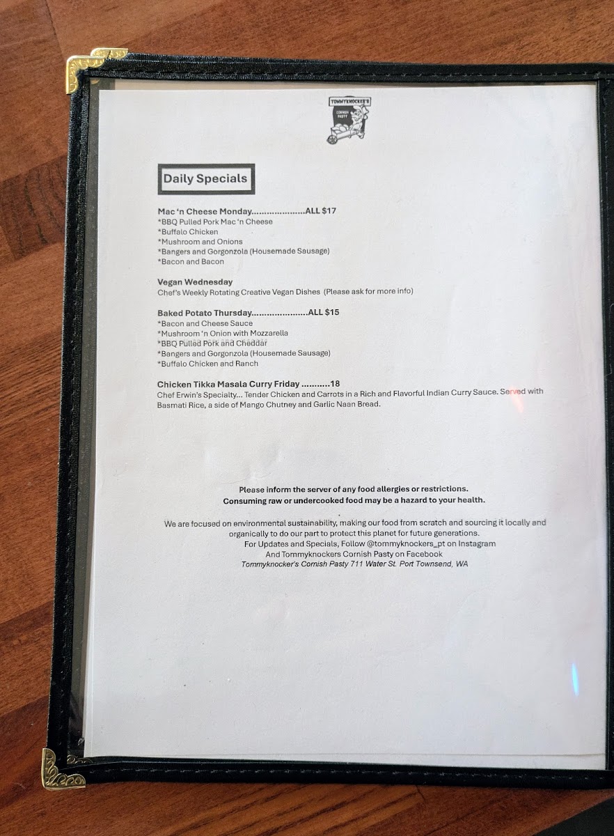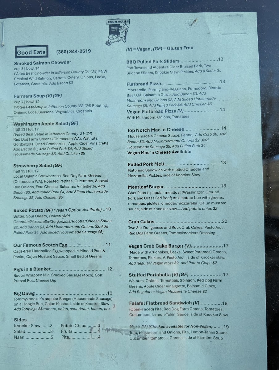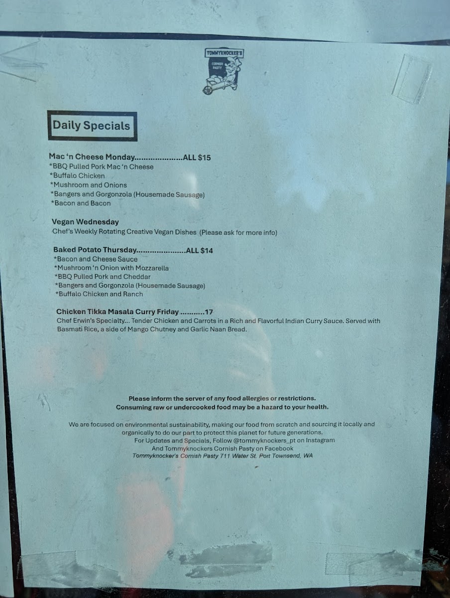 Guests often find themselves enjoying these dishes during lunch or dinner, where the generous portions and homestyle flavors encourage sharing and lingering over good conversation. Whether you're stopping in for a quick bite or settling down for a relaxed meal, the menu’s emphasis on rich, savory pasties like the Lamb & Mint or Vegan Shepherd’s Pie, alongside housemade sides and comforting pasta dishes, complements the warm and casual atmosphere of this Port Townsend spot.